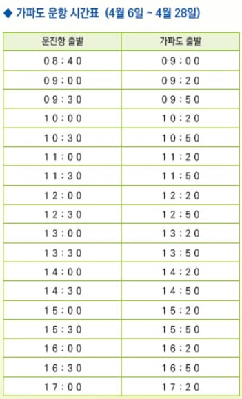 기상악화 또는 회사사정으로 운항시간이 변경될 수 있으니 실시간 운항정보를 홈페이지나 전화로 확인 바랍니다.